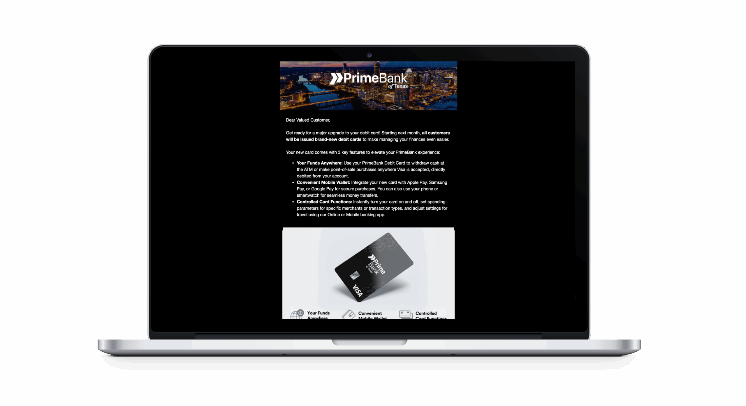 PrimeBank is a thriving, growth-oriented community bank with deep roots and a bold vision. Initially chartered in 2003 as Capital Bank of Texas (CBOT), the bank is headquartered in the heart of Austin, Texas, and proudly serves South Texas communities like Carrizo Springs and Crystal City. Under the leadership of President and Co-Founder Tanya Miller and Chairman, CEO, and Co-Founder Bobby Priestley, PrimeBank’s current assets now exceed $215 million. Their initial goal was to grow their email list and directly connect with their existing customers, particularly in South Texas, where the information was lacking. We also supported them with expanding the visual brand to fully define their messaging and creative assets.
